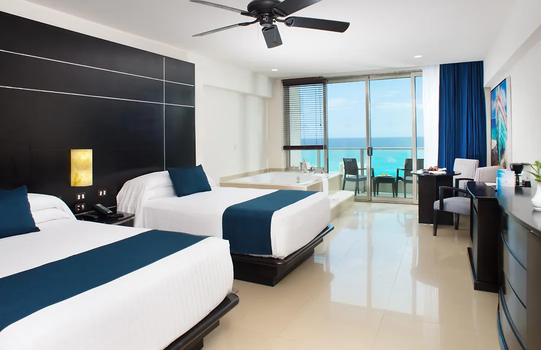 Las suites del Seadust Cancun Family Resort incluyen características como un balcón privado y vistas parciales u oceanfront. Cada habitación tiene una cama King o dos camas dobles, así como un minibar abastecido diariamente y Wi-Fi gratis, adaptándose a familias o grupos de hasta cinco personas.